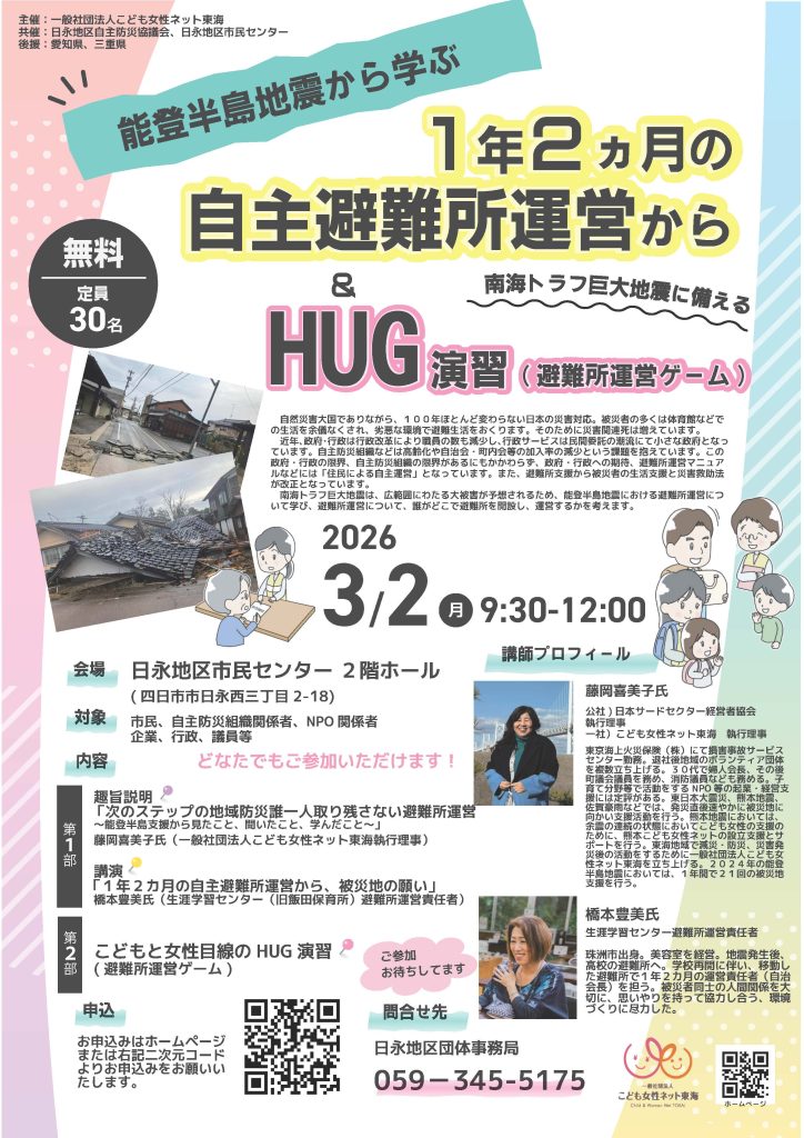 3/2(月)能登半島地震から学ぶ「1年2ヵ月の自主避難所運営から」&HUG演習